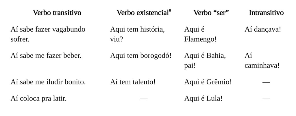 (3) Aí sabe me fazer beber. Aí sabe fazer vagabundo sofrer. Aí sabe iludir bonito e nós só apaixona em mulher desse tipo…