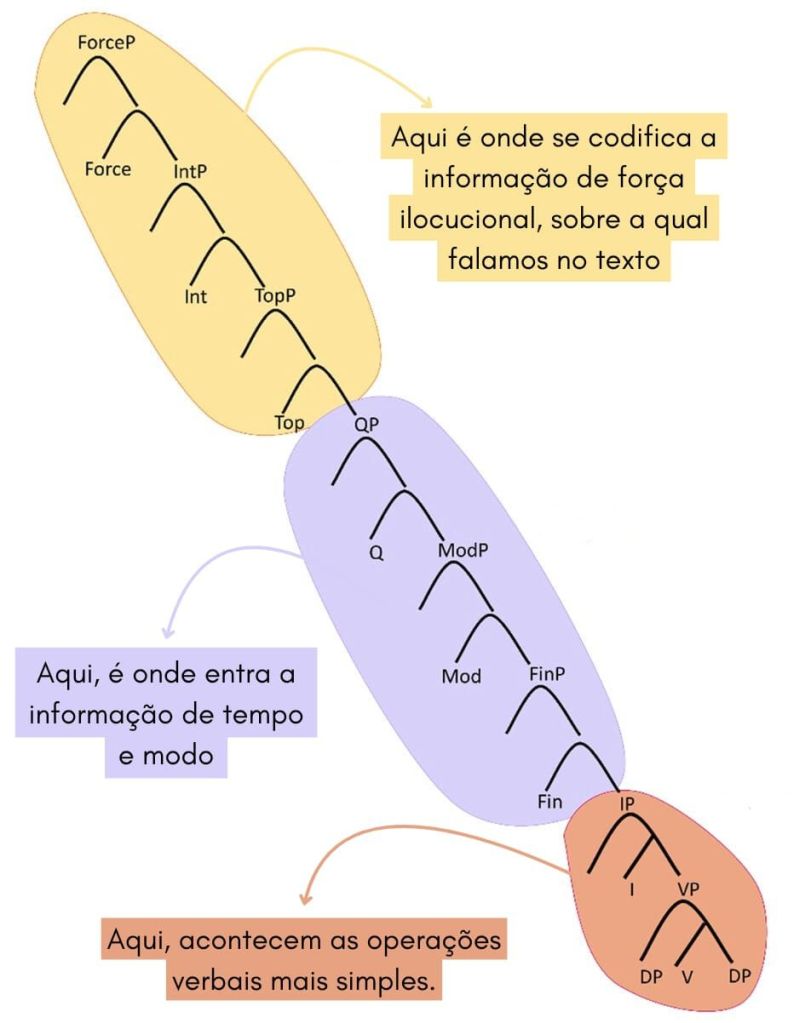 Em consonância com a “hipótese da árvore crescente”, verificamos que as informações que caracterizam uma sentença como “O que a Ana comeu?” — como, por exemplo, o fato de ser uma pergunta, de a situação ocorrer no passado e de ter um agente praticante da ação — não são adquiridas ao mesmo tempo. Inicialmente, a criança em fase de aquisição entende que o evento de “comer” foi praticado por “a Ana” e que algo foi comido, sendo esse algo representado por “o que”. Em seguida, compreende-se que tal evento ocorreu em um momento anterior ao presente, isto é, no passado. Finalmente, adquire-se a informação de que essa oração tem o valor de uma pergunta, já que, nesse caso, o termo-alvo desta interrogação é a expressão “o que”, que, por sua vez, é o objeto direto do verbo “comer”. Mas, ao invés de “o que” ocupar a posição esperada (depois do verbo, já que é objeto direto), ele foi deslocado para o início da frase interrogativa (algo que foi estudado por uma de nós: Lucas (2024)). O “o que” está veiculando uma frase interrogativa, não é? Pois bem, é isso que chamamos de força ilocucional! A força ilocucional define se uma sentença é uma pergunta, uma afirmação ou uma negação.